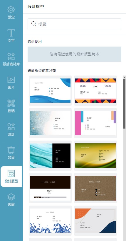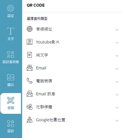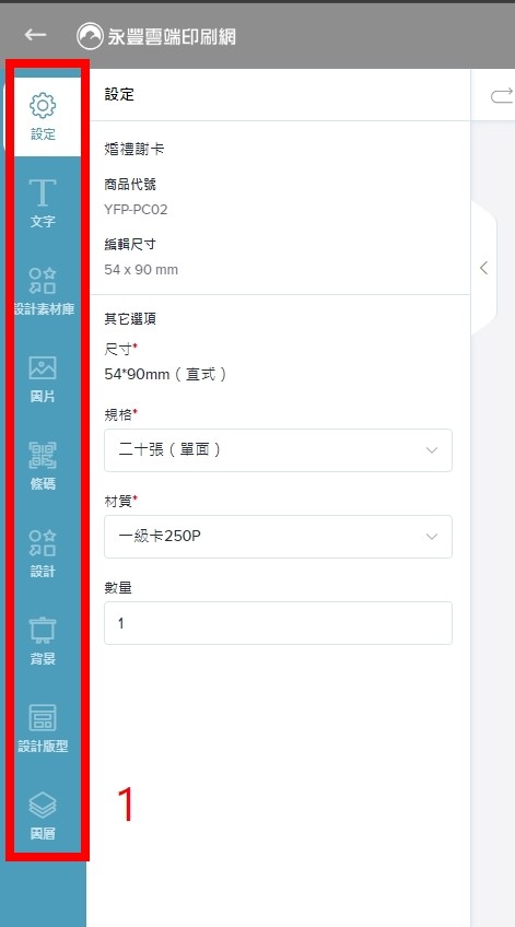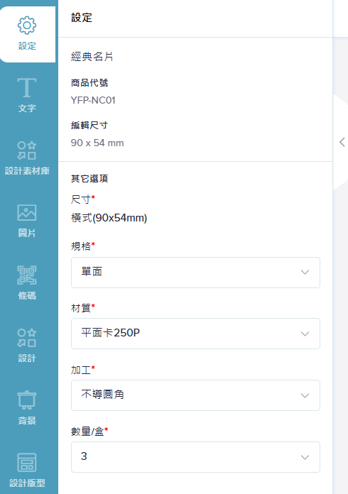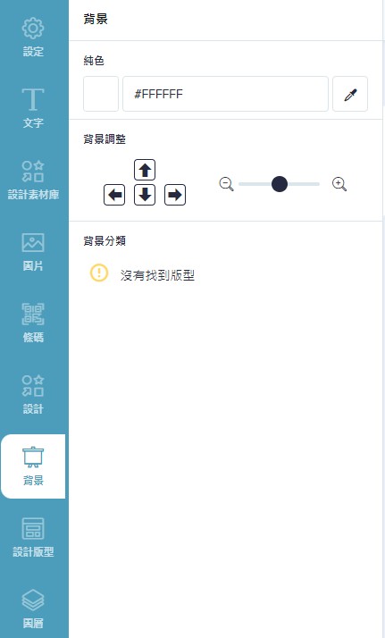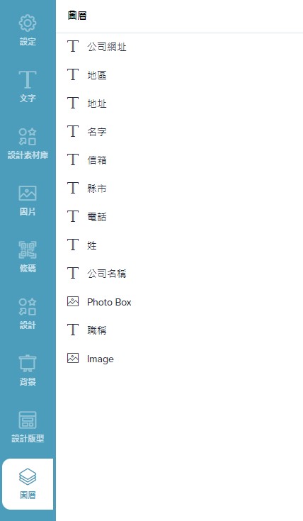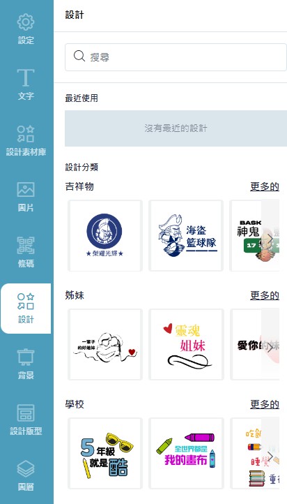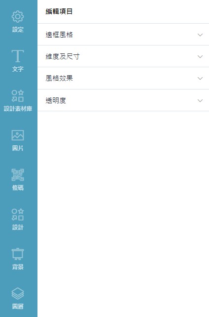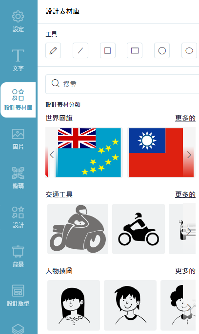 包含設定、文字、設計素材庫、圖片、條碼、設計、背景、設計版型、圖層功能。