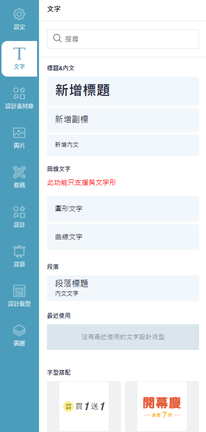 這裡可以任意新增各種文字類型標題&內文、曲線文字(目前只支援英文)、段落文字。