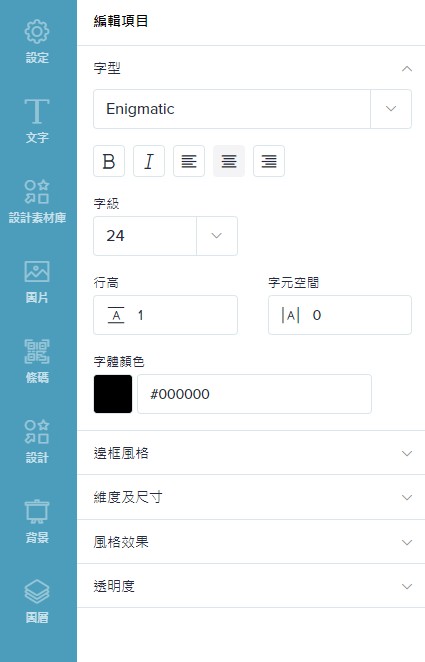 點擊設計區域中的文字,即可進入「編輯項目」,可編輯字型、粗斜體、位置、字級、行高、字元空間、顏色、邊框風格、維度及尺寸、裝飾選項、透明度。