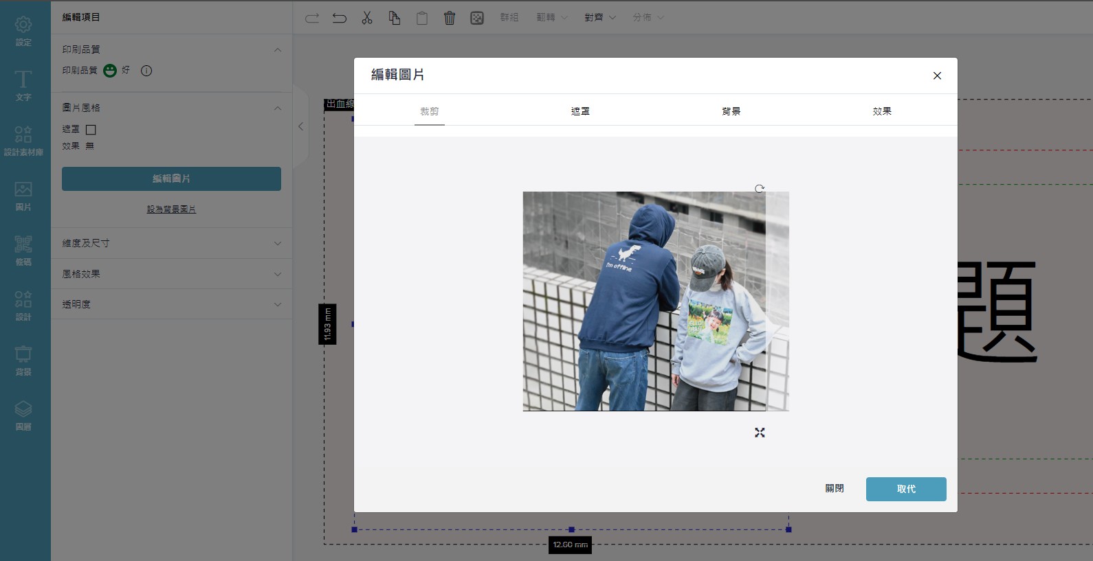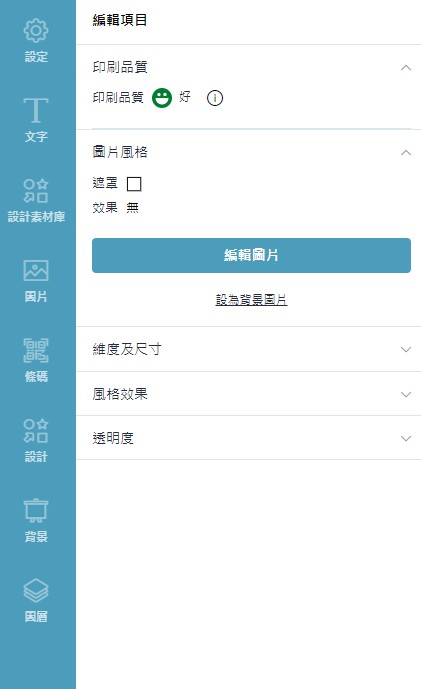 圖片置入設計區域後,點擊該圖片,進入「編輯項目」,即可檢查圖片的印刷品質,並可編輯圖片風格(包含剪裁、遮罩、背景、效果功能)、調整維度及尺寸、裝飾選項、透明度。