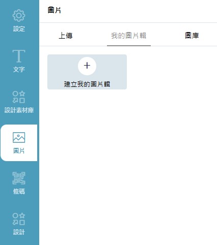 d-2. 我的圖片輯:若您是登入狀態,並且有先在帳戶中的「我的圖庫」中建立相簿上傳圖片,即可在此直接將已儲存的圖片放入設計區域。此外,也可以從這裡直接建立自己的圖片輯。