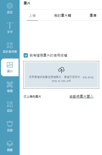上傳圖片後,點擊「自動將圖片置入」,圖片即會自動置入設計區域中的圖片框中。