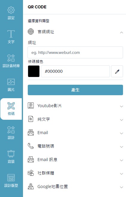 選擇您想要產出QR CODE的資料來源,輸入相應的內容,即可自動產出QR CODE,還可以更改OQ CODE的顏色。