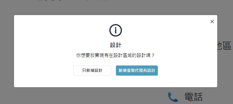 有多種不同主題的設計組合圖,點擊選擇喜歡的設計組合圖時,會跳出提醒「你想要放棄現有在設計區域的設計嗎?」,請注意!選擇「只新增設計」即會將設計組合圖新增置入設計區,原本您的設計仍會保留;選擇「新增並取代現有設計」您原本的設計將會消失,直接由此設計組合圖取代,且無法復原。