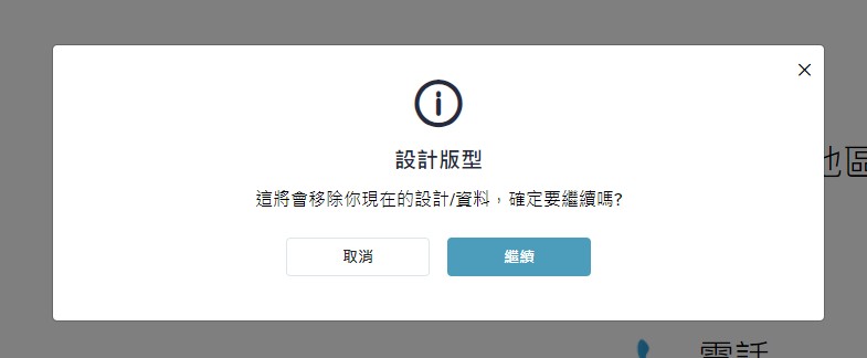 在這裡可以更換設計版型(即一開始選擇的「設計版型」),請注意!這裡一但更換成新的設計版型,將會把您原本的所有設計與編輯資料都取代覆蓋,且無法復原,如您確定要完全取代原設計,請按下「繼續」。