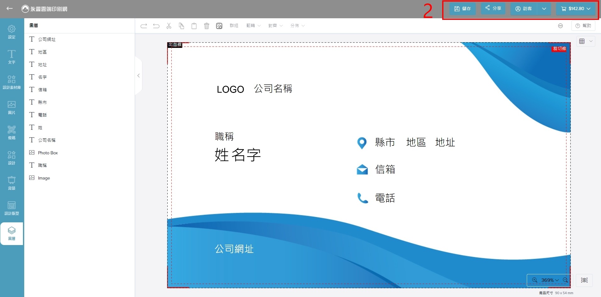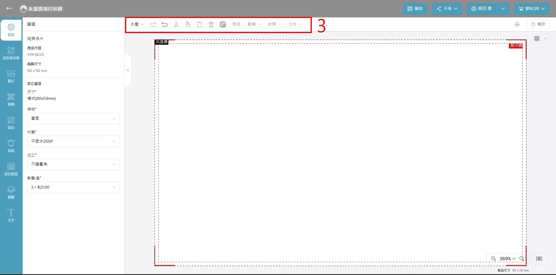 3.工具列功能說明—(2)操作列 包含儲存設計、分享設計、登入、加入購物袋