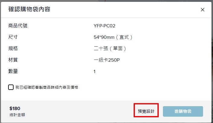 此處會呈現商品總金額,也可以再點擊此處,重新選擇變更印刷規格等需求,選擇完成後,點擊「加入購物袋」,會跳出印前最後的確認視窗,確認完所有印刷規格需求與價格後,勾選「我已經確認客製商品詳細內容及價錢」,再點擊「進購物袋」,即可將商品加入購物袋。