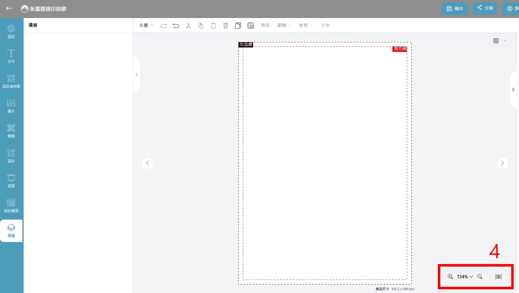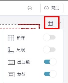 可以選擇是否在設計區域中開啟「格線」或「尺規」來幫助排版與對齊,也可選擇是否關閉「出血線」與「裁切線(裁剪)」,請注意!為了避免印刷時未保留足夠的邊界導致裁切到重要資訊或露出白邊,請務必保持開啟「出血線」與「裁切線」功能。