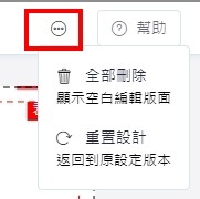 「全部刪除」會將設計區域中所有設計刪除,回復到空白的頁面。「重置設計」會將目前的設計回復到您最一開始進入編輯器時的設計樣式。(請注意!一但選擇「重置設計」後,就無法再透過「上一步」回到前一個動作。)