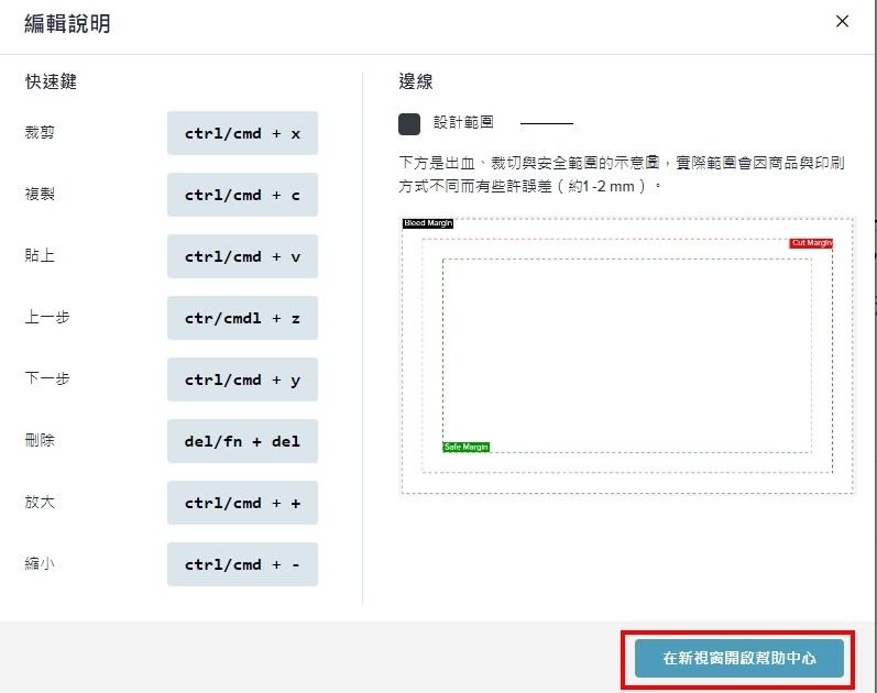 點擊「幫助」會跳出編輯說明,包含快捷鍵與設計區域中的邊線說明。若再點擊編輯說明右下角的「在新視窗開啟幫助中心」則會開啟「幫助中心」頁面。